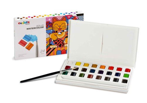 Acuarelas sólidas. Colores súper pigmentados y fáciles de mezclar. Resistentes a la luz. La tapa se puede usar como paleta para mezclar colores. Pincel incluido.