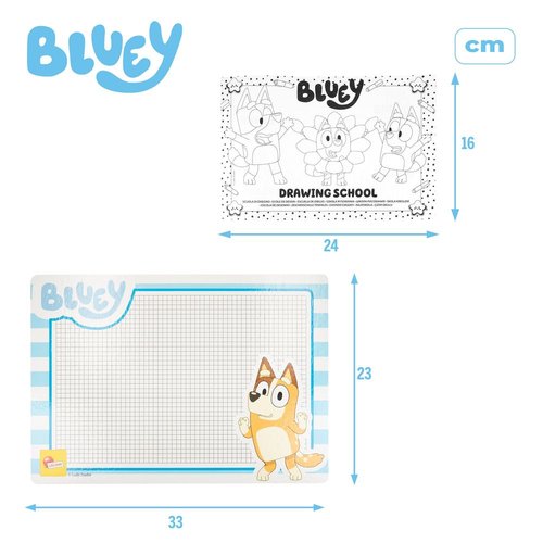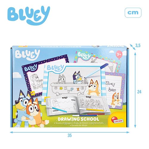 íCon la Drawing School de Bluey no hay límites para tu imaginación Este kit creativo viene con un cuaderno con dibujos organizados por dificultad progresiva, con 4 pizarras que te permiten escribir y borrar todas las veces que quieras sobre ellas, con 4 rotuladores de colores (amarillo, azul cielo, naranja y azul) y con 1 rotulador borrable. Es perfecto para que los niños aprendan a escribir y desarrollen su creatividad e imaginación junto a sus personajes Bluey favoritos.