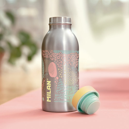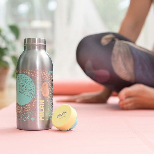 Botella isotérmica de acero inoxidable. Serie Silver, tapón de color amarillo. Capacidad: 354 ml. Botella isotérmica con doble pared de acero inoxidable que mantiene la temperatura del líquido contenido. Tapón de rosca hermético, con junta depolipropileno. Cuando el contenido es una bebida fría, se evitan las condensaciones exteriores. Con bebidas calientes se conserva la temperatura del interior y la superficie exterior se mantiene a temperatura ambiente. We protect: el uso de botellasreutilizables contribuye a reducir el consumo de plástico con las botellas desechables de un solo uso.