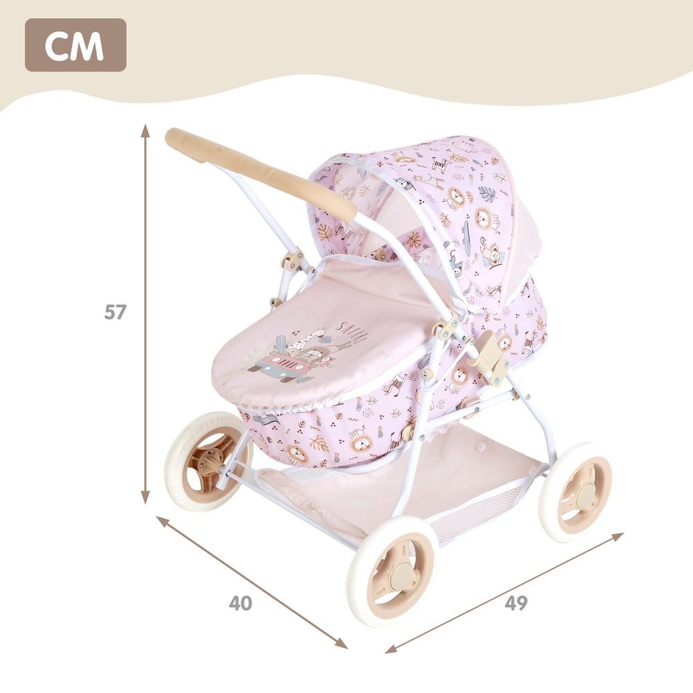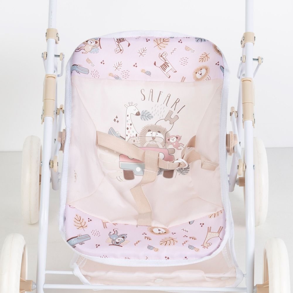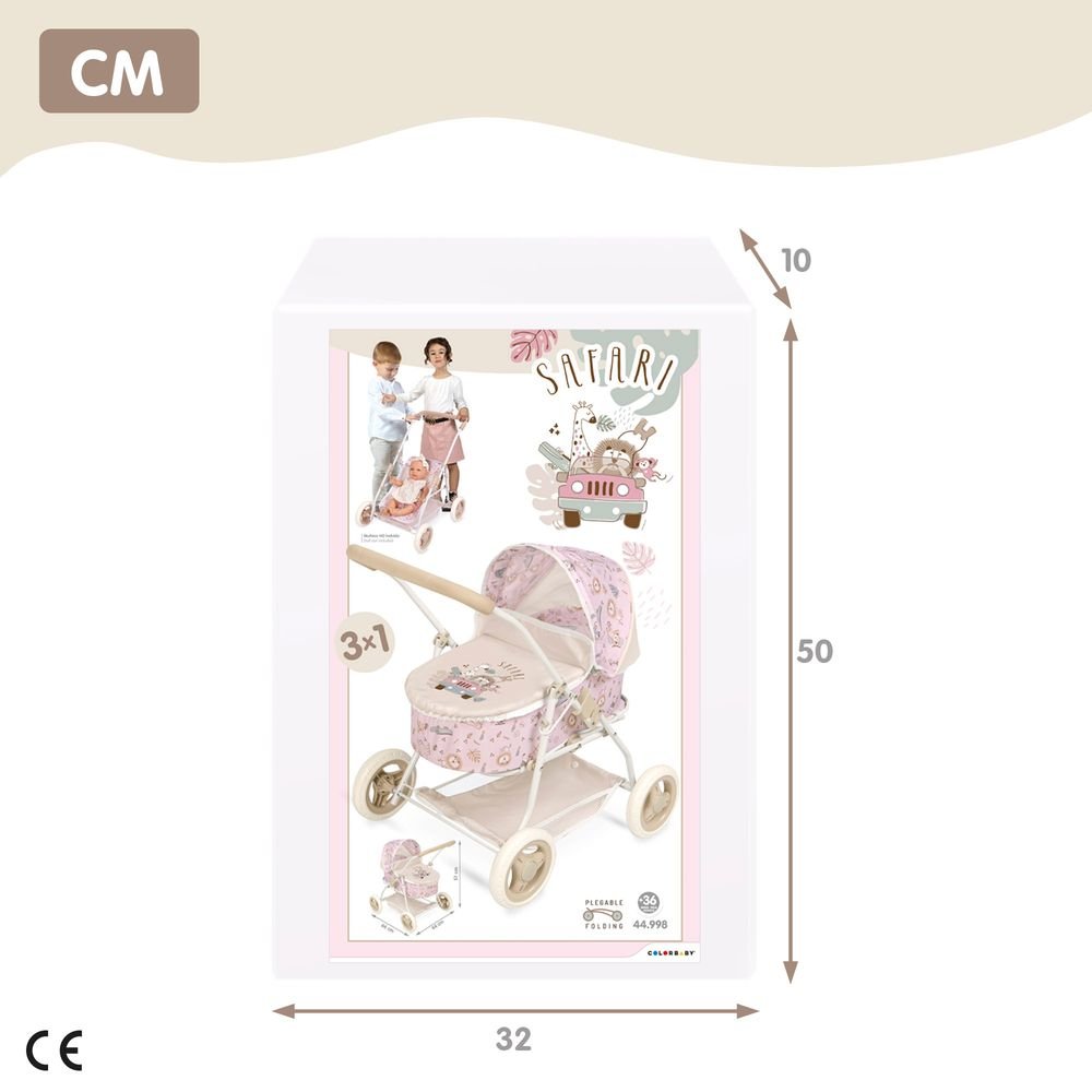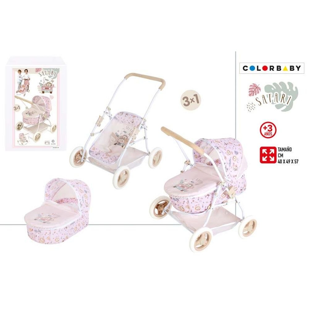íEste adorable carro de paseo para muñecas bebé de la colección Safari COLORBABY es el accesorio perfecto para tu bebé Con un diseño 2 en 1 suave y agradable en tonos rosa con motivos de animalitos, este carro se adaptará fácilmente a tus paseos: podrás usarlo como carro con capazo o como carrito con sillita. El capazo cuenta con estructura rígida, visera modulable y mantita de quita y pon, y va fijado a la estructura del carro con velcro. La sillita se puede ajustar con menor o mayor inclinación y cuenta con cinturón para proteger al muñeco bebé durante el paseo. íTan solo tendrás que poner o quitar el velcro del capazo para transformar el carro de paseo en una sillita El carrito mide 27x53x56 cm, tiene mango acolchado para mayor comodidad y una cesta inferior donde podrás colocar todos los accesorios del bebé que vayas a necesitar durante el paseo. Se trata de un juguete de imitación que desarrolla la imaginación y la socialización y fomenta la afectividad.
