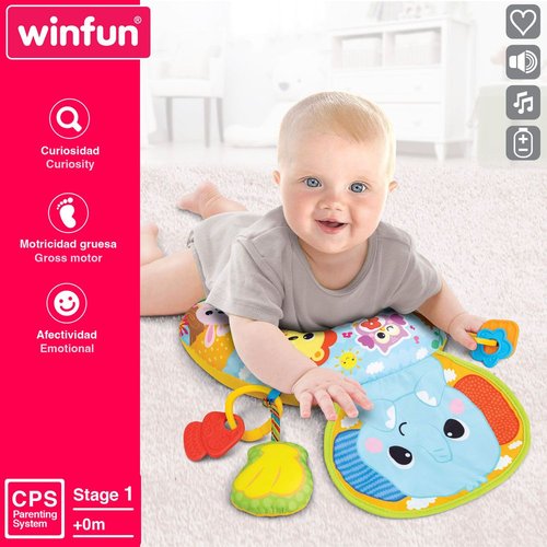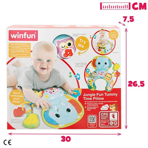 La almohada Winfun es el juguete perfecto para que tu bebé juegue de forma segura y divertida, ya sea sentado o boca abajo. Su encantador diseño en forma de media luna está decorado con adorables animales de la jungla, y ofrece una experiencia interactiva única gracias a las anillas sonajero, el chirriador y el mordedor seguro para los más pequeños. Además, estimula los sentidos con sonidos de arrugas al tocar el elefante, sonidos chirriantes al tocar la concha y alegres melodías al tocar el búho. También destaca por su versatilidad gracias a los clips que permiten enganchar los elementos interactivos en sillas de paseo, cunas o asientos de coche. Se puede limpiar fácilmente gracias a la caja de música extraíble y es un juguete que favorece la estimulación sensorial y desarrolla la imaginación y las emociones.