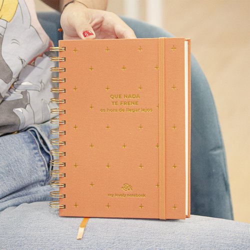 íEl nuevo cuaderno entelado para todas aquellas personas que son imparables y que no permiten que nada les detenga Leno de espacio para que la imaginación te siga allá donde vayas y apuntes todas tus notas, ideas, pensamientos y planes. Además, el diseño entelado con el stamping y estos pequeños destellos en dorado nos tiene totalmente enamorados. Y para seguir sumando, goma de cierre y cinta de registro. ¿Se puede pedir algo más? Pues sí Bolsillo interior para que no se te pierda nada de nada.