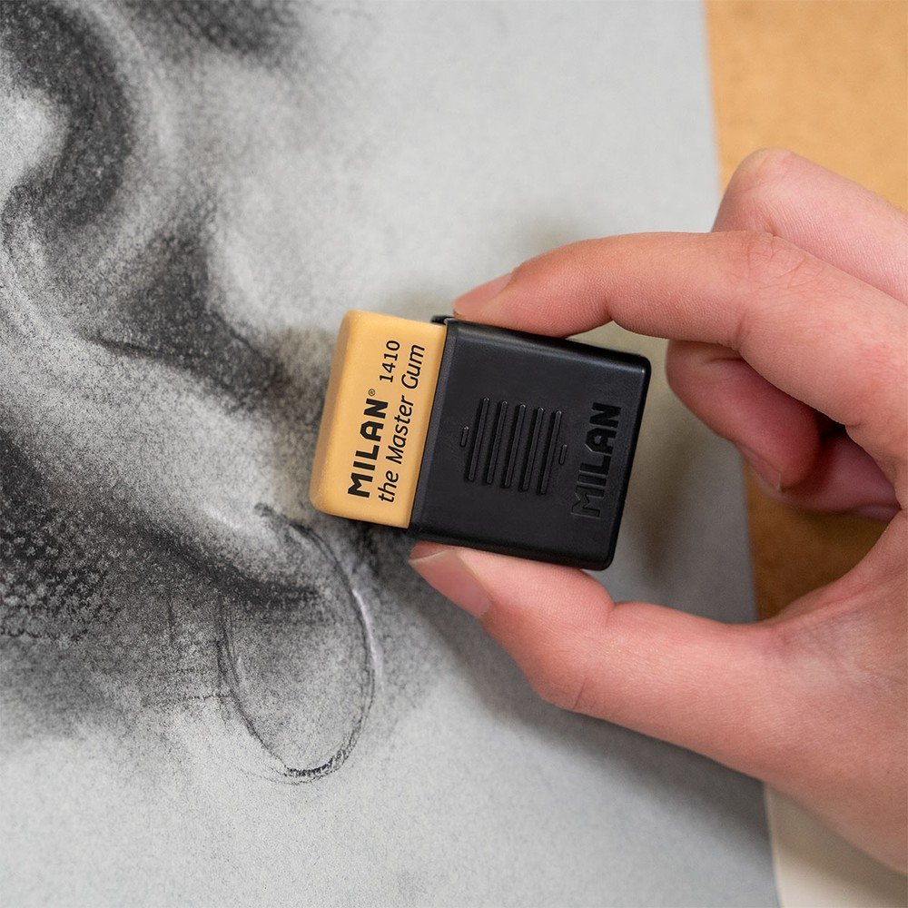 Goma especial para bellas artes The Master Gum con funda protectora rígida. Fabricada con caucho sintético tipo ´miga de pan´, tiene una gran capacidad de adsorción: borra fácilmente sin necesidad de presionar sobre la superficie del papel, formando suaves migajas. Se utiliza también para difuminar trazos de dibujos con carboncillo y para restauración y limpieza de documentos. Medidas goma: 4,5 x 3,5 x 1,9ácm. Las gomas de borrar MILAN están fabricadas en España desde 1918.