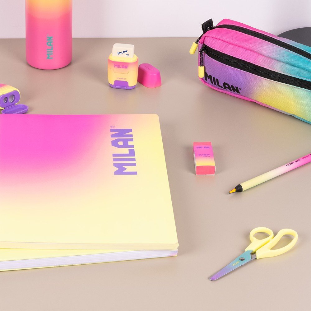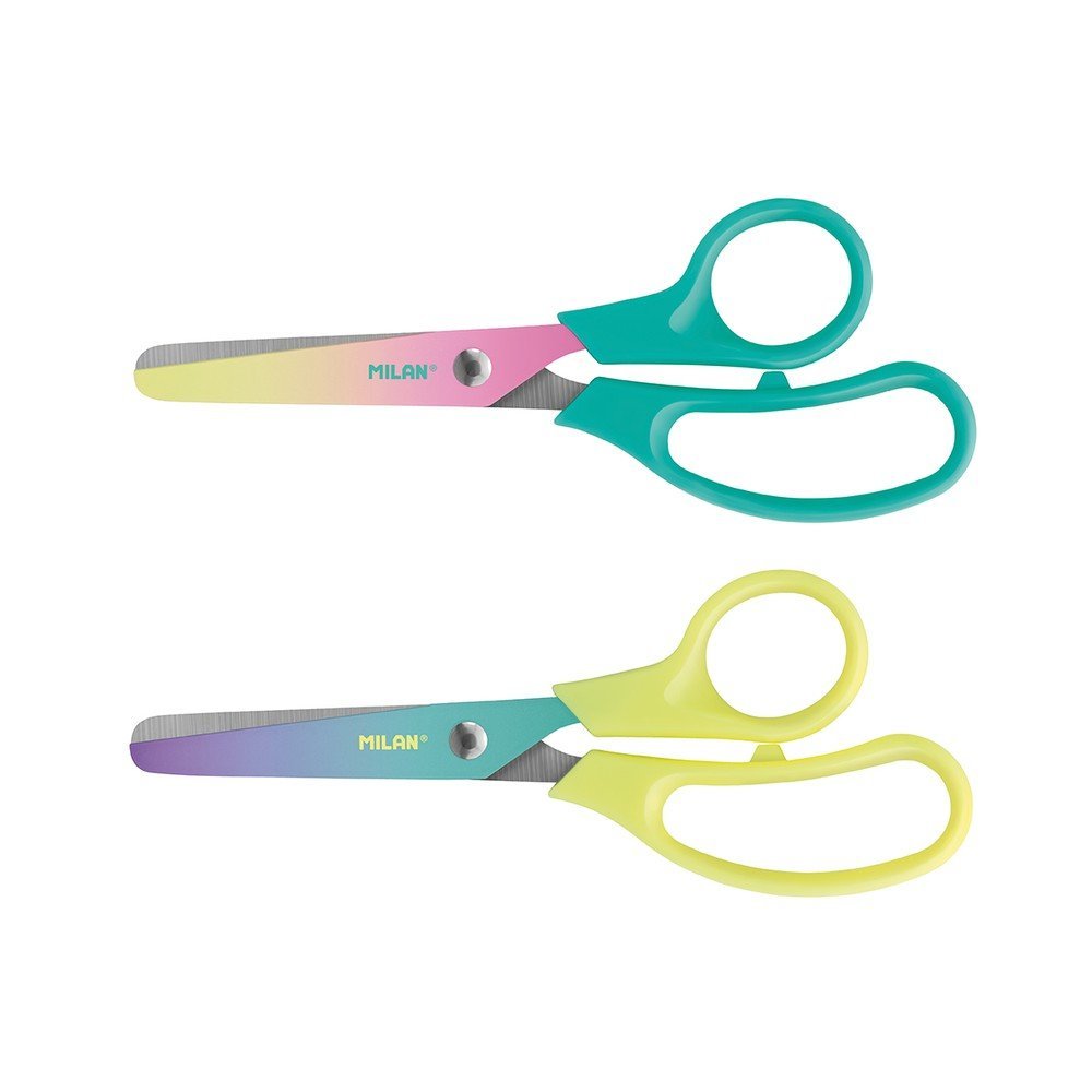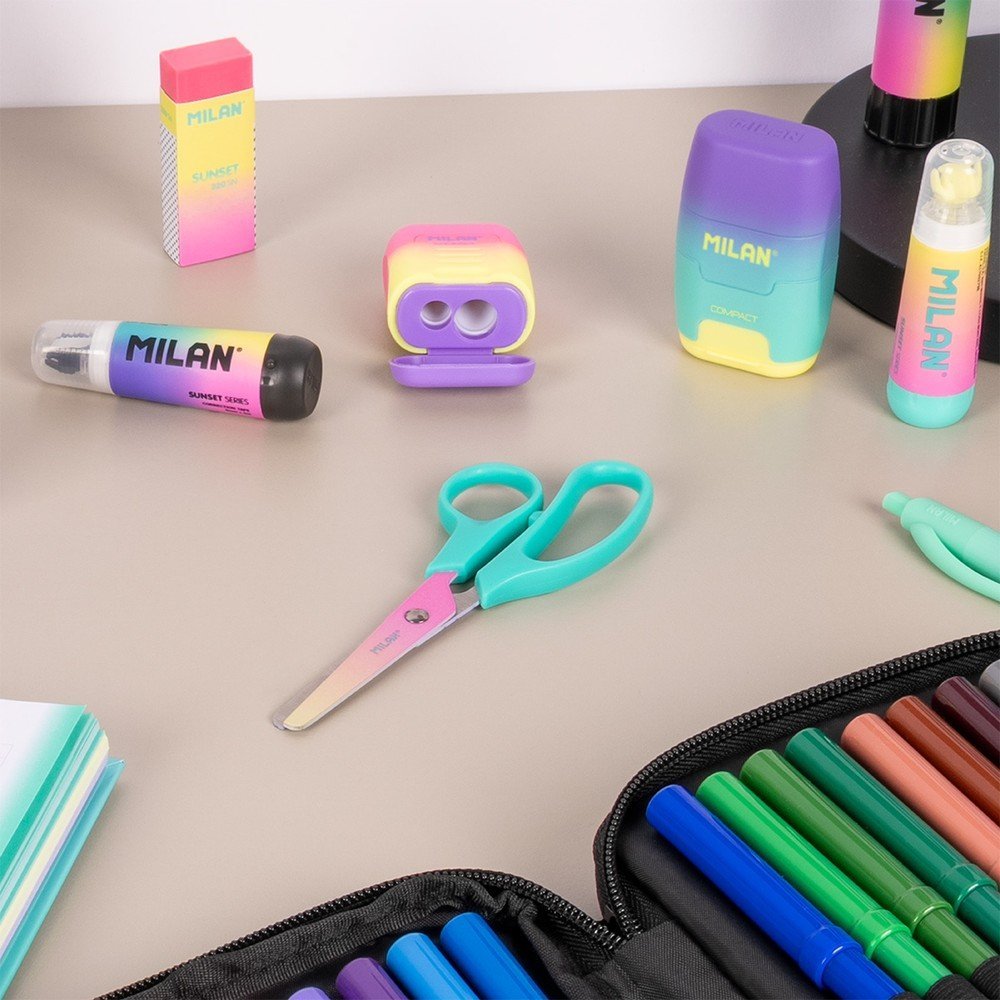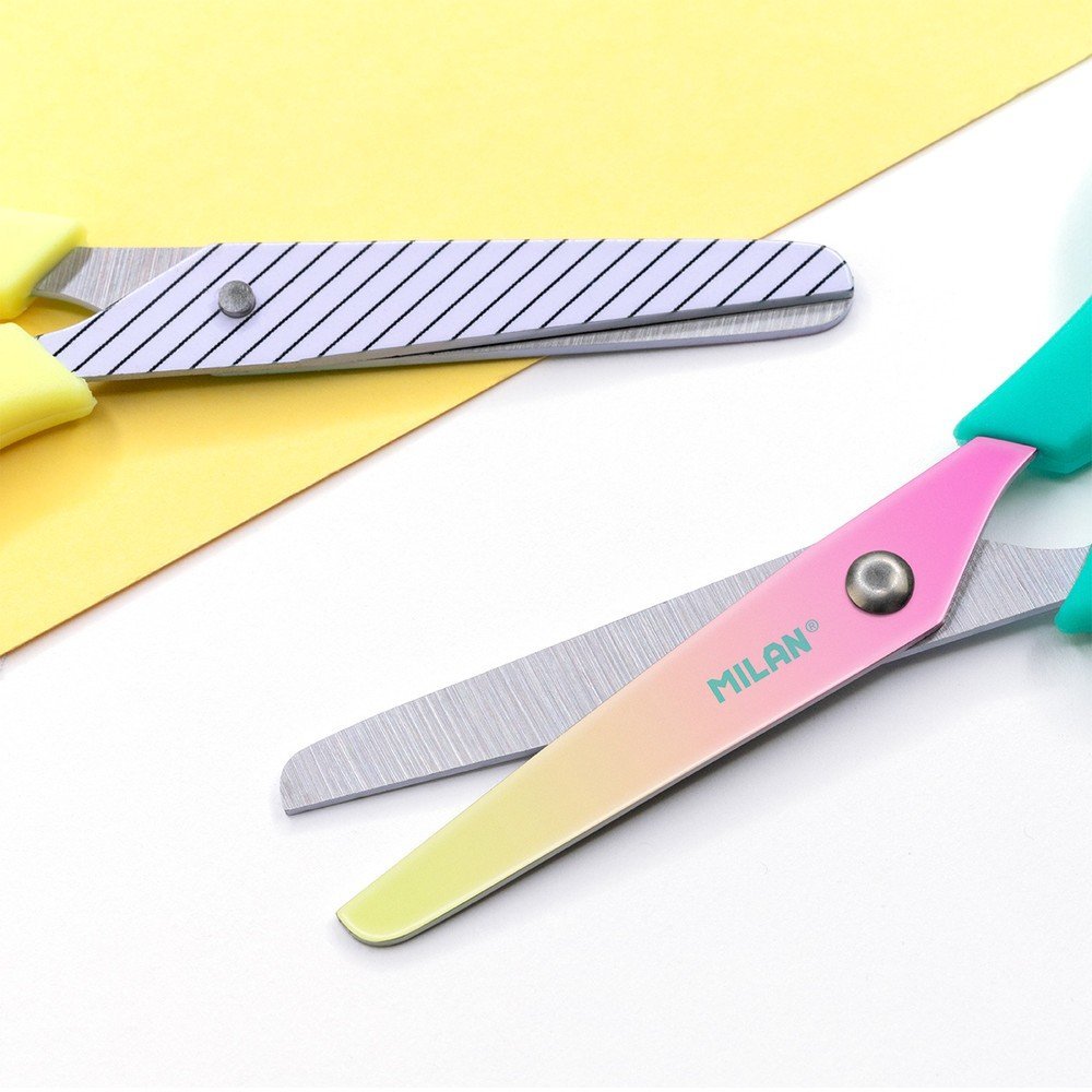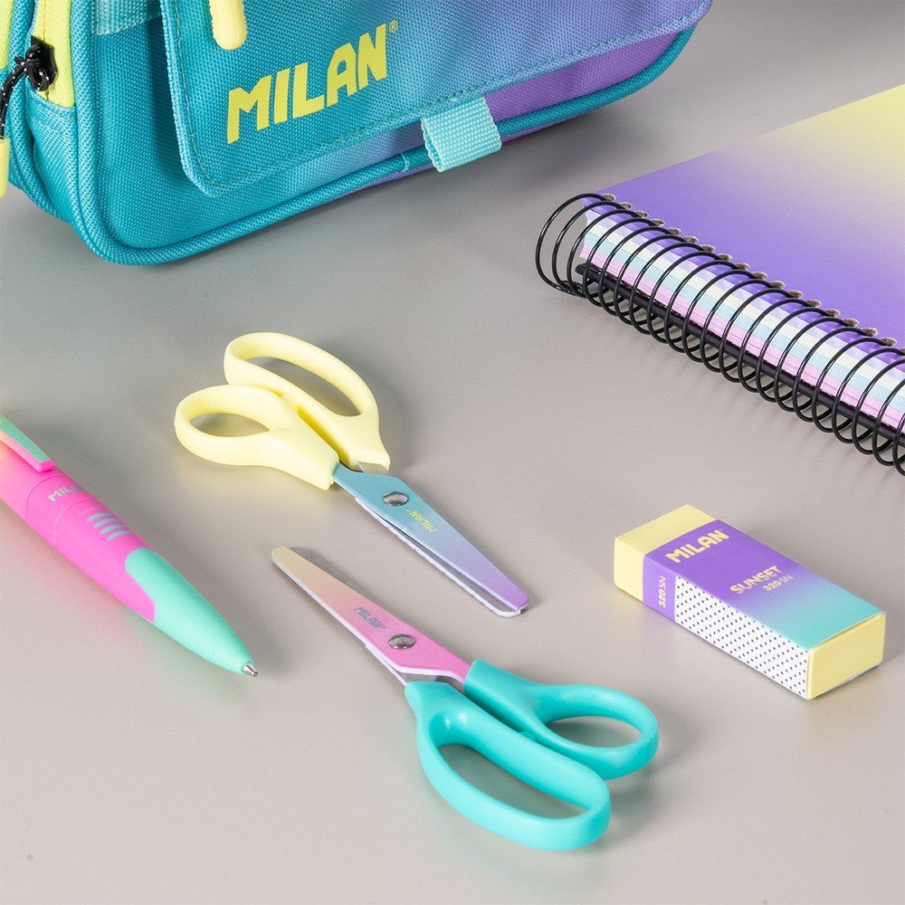 Tijeras modelo basic, Colección Sunset. Hoja de colores degradados por un lado y estampado geométrico en blanco y negro por el otro. Hoja de acero inoxidable y punta redondeada. Mango de plástico. Ideal para uso escolar. Contiente: 12 tijeras con mango color turquesa y 12 amarillo. Colección Sunset: una combinación de colores degradados inspirados en el atardecer mediterráneo, acompañados de detalles en blanco y negro. Medidas: 13,4 x 5,3 x 1,1 cm.
