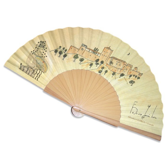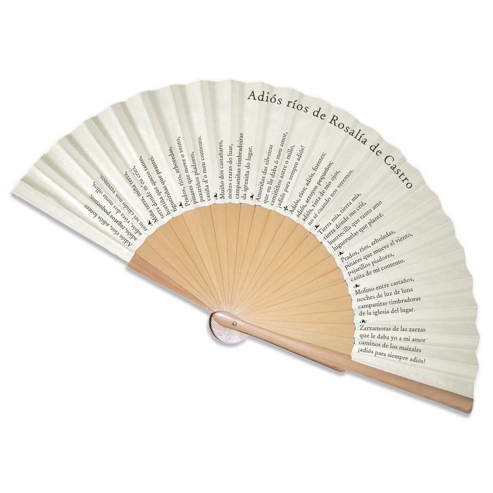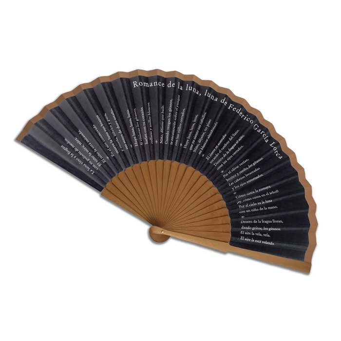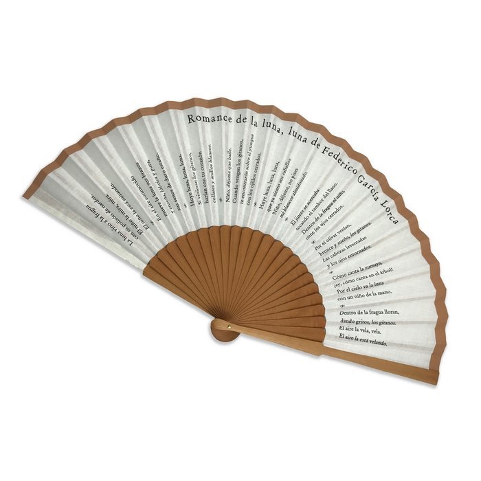 10 Abanicos Literarios. Lorca, Alhambra Lorca, Rosalia de Castro y MUJER-CITAS Abanicos de madera de sicomoro. 23 cm. Impresión color y serigrafiado Presentación individual: Cartón microcanal con fajín. Expositor: Cilindro de cristal grueso 120 x 120 mm.