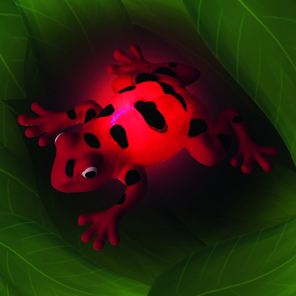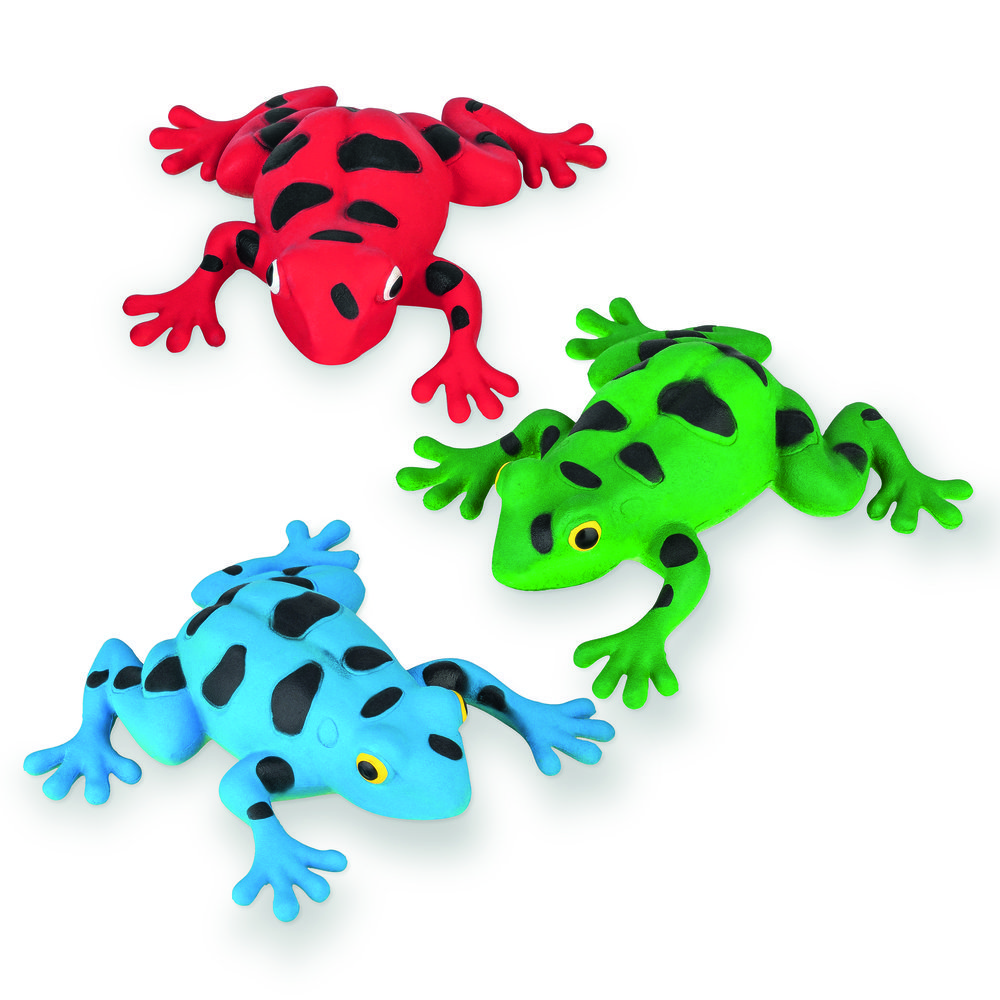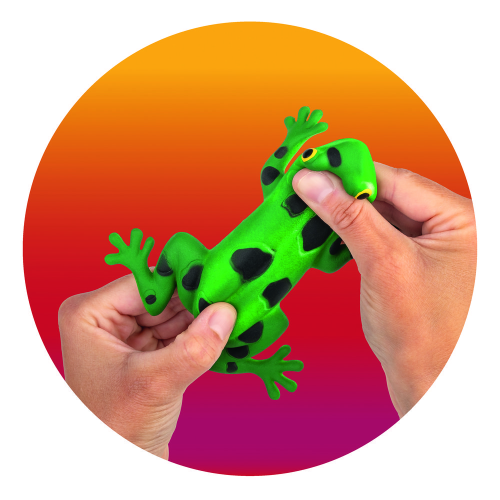 Sapo luminoso ZOO que brilla en la oscuridad. í3 sapos surtidos que se divierten con la luz Este sapo de tamaño natural con textura gomosa se puede aplastar y estirar, y su barriga brilla en la oscuridad. El efecto de luz intermitente rojo-azul se activa con un ligero toque. Disponible en 3 colores: rojo, verde y azul.
