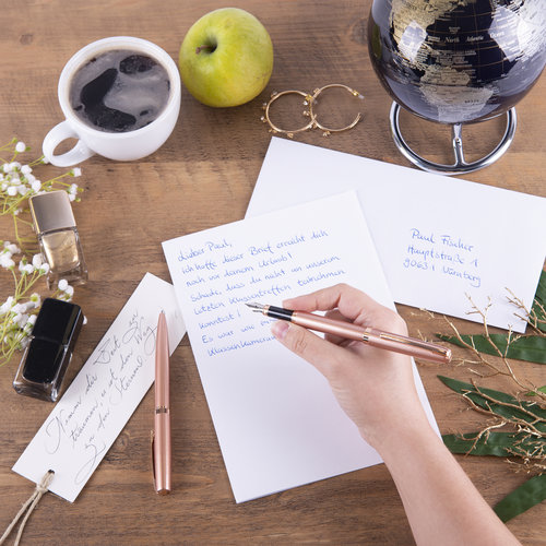 Set pluma y bolígrafo. Cuerpo de metal y superficie acabado mate. La pluma tiene un plumín de iridio, trazo M e incluye un cartucho de tinta negro. Recargable con cartuchos de tinta estándar. Bolígrafo tinta color negro, punta media. Color de cuerpo rosado con detalles dorados. Se presenta en caja tipo quot;Deco?.