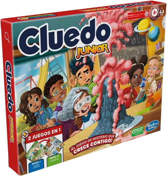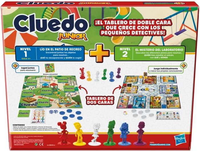 Ahora los niños y niñas en edad preescolar podrán resolver misterios con el juego Cluedo Junior, que cuenta con 2 niveles de diversión. Este juego de mesa es para jugadores a partir de 4 años e incluye un tablero de doble cara para 2 niveles de juego. El Nivel 1 se juega en equipo, resolviendo todos juntos el misterio del patio de recreo. Uno de los personajes ha metido por error un objeto en su mochila. Todos los jugadores ayudan en la investigación del patio de recreo, buscando pistas en las imágenes de las baldosas. Deberán averiguar juntos qué objeto ha desaparecido y quién lo ha cogido para resolver el misterio. Cuando los detectives junior estén preparados para un reto mayor, pueden dar la vuelta al tablero para jugar al Nivel 2 y competir para resolver el misterio del laboratorio. ¿Quién ha hecho estallar el volcán, con qué y dónde estuvo el culpable antes de hacerlo? El juego Cluedo Junior es para 2 a 4 jugadores. Es un divertido juego para jugar en familia, íy un gran regalo p