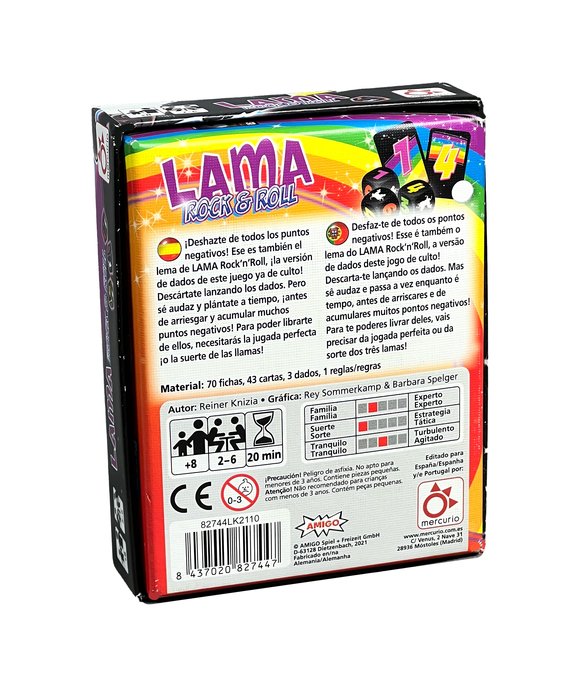 íDeshazte de todos los puntos negativos Ese es también el lema de LAMA Rock?n?Roll, íla versión de dados de este juego ya de culto Descártate lanzando los dados. Pero sé audaz y plántate a tiempo, íantes de arriesgar y acumular muchos puntos negativos Para poder librarte de ellos, necesitarás la jugada perfecta ío la suerte de las llamas