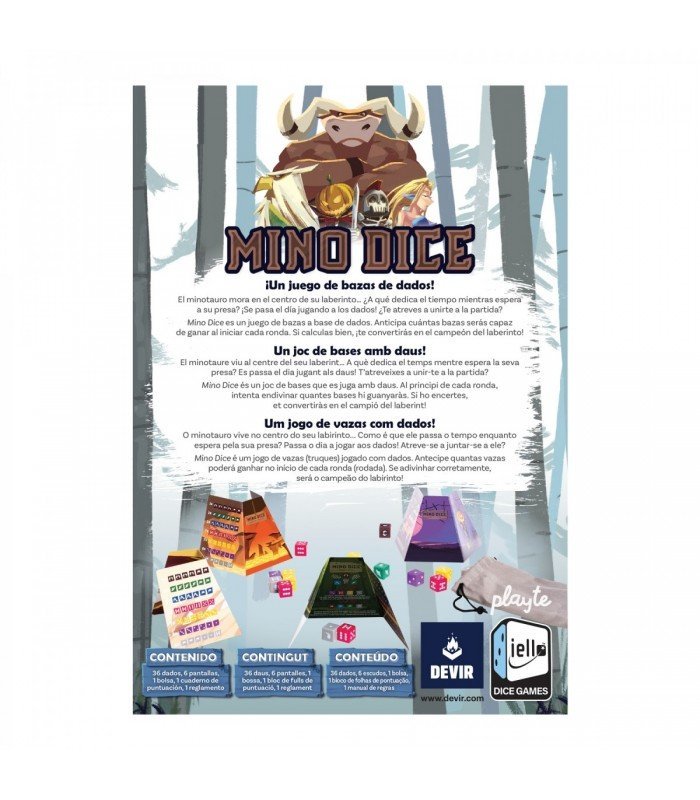 El minotauro vive en el centro de su laberinto? ¿A qué dedica el tiempo mientras espera a su presa? íSe pasa el día jugando a los dados ¿Te atreves a unirte a la partida? Mino Dice es un juego de bazas a base de dados. Anticipa cuantas bazas serás capaz de ganar al iniciar la ronda. Si calculas bien, íte convertirás en el campeón del laberinto