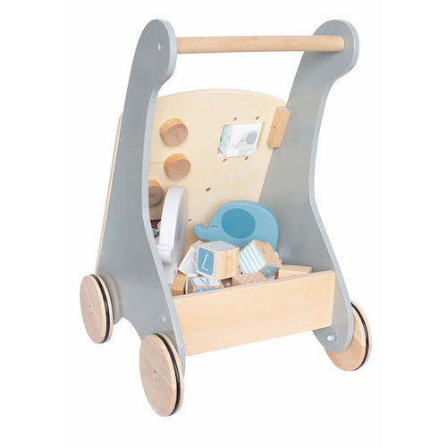 Nuestro nuevo y dulce carro de actividades es un juguete divertido. Combina divertidos juegos de actividades para que el niño desarrolle sus sentidos y habilidades motoras. El carrito de actividades no solo anima a su hijo a aprender a caminar, sino que también le ayuda a desarrollar el equilibrio y la motricidad fina. Ahora se abre un mundo completamente nuevo para su hijo, que puede caminar como nunca antes. Hay un pequeño circuito de bolas en el que el niño puede hacer girar y subirlas y bajarlas. Un bloque cuadrado con diferentes motivos de animales en todos los lados para que el niño pueda mezclar personajes divertidos. 3 ruedas dentadas de alegres colores para hacerlas girar. 6 estrellas de colores que puedes girar. El carro tiene ruedas de madera maciza con bordes de goma para pasar suavemente por todos los suelos sin dejar marca. En la parte trasera del carrito hay una caja donde puedes poner todos tus juguetes favoritos. Medidas 33 x 29 x 47 cm