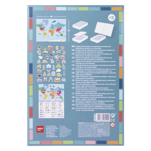 Juego magnético con temática mapamundi. Ayuda a explicar el mundo a los más pequeños, sus continentes y algunos de los monumentos y animales más emblemáticos de cada lugar. Fomenta la observación y aumenta la concentración y la atención. Contenido: 1 escenario de 36 x 28 cm y 40 fichas magnéticas.