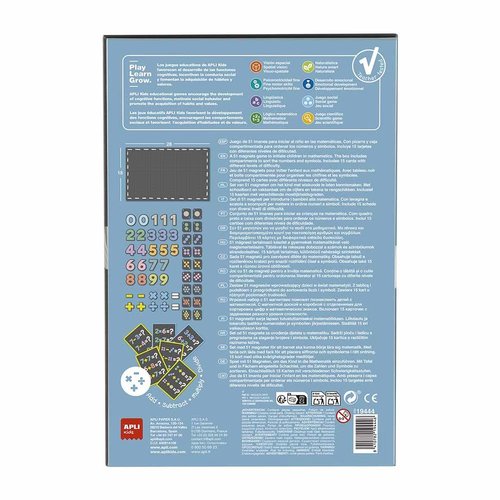 Juego magnético modelo Números para introducirse en el mundo de las matemáticas. El juego contiene 1 escenario imantando de 280 x 180 mm para encajar en la base de la caja con compartimentos para poder ordenar los números y los símbolos. Incluye 51 imanes de números y símbolos y 15 fichas con ejemplos para que el niño aprenda sus primeras operaciones matemáticas. Este producto ayuda a desarrollar la psicomotricidad fina, la memoria y la imaginación, fomenta la concentración y promueve el trabajo lógico-matemático. Recomendado para niños a partir de 5 años.