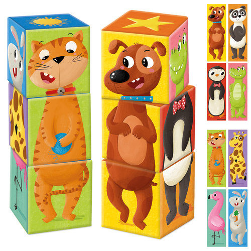 Gira los 6 cubos y haz diferentes combinaciones, aparecerán 8 divertidos animales: un perro, un panda, un gato, una jirafa, un pingüino, un cocodrilo, un conejo y un flamenco. Puedes combinar los cubos para ver los diferentes animales o puedes mezclarlos para crear nuevas imágenes. El color del fondo de la ilustración ayudará a los niños a formar el puzle correctamente.