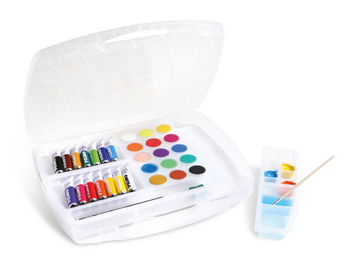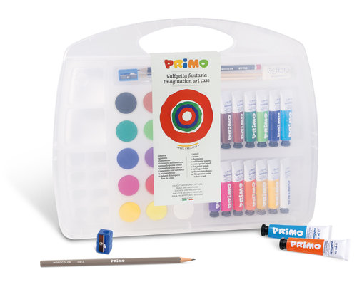 Fantasia: caja con 14 Témpera en tubos de 12 ml y 15 acuarelas de 30 mm de diámetro, 1 pincel, 1 lápiz HB, 1 goma de borrar, 1 sacapuntas, 1 paleta mezcladora. Con caballete de dibujo