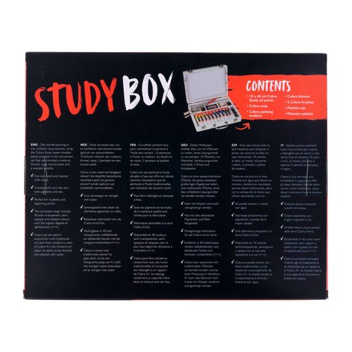 Esta práctica caja contiene todo lo necesario para empezar a pintar al óleo sin necesidad de disolventes. El set incluye una selección de diez colores al óleo mezclables con agua de Cobra Study, un frasco de medio para pintar, nuestro diluyente sin disolventes y varios accesorios para ayudarte a empezar. Contenido: 10 x 40 ml (105 Blanco de Titanio - 266 Anaranjado Permanente - 275 Amarillo Primario - 315 Rojo Pyrrole - 369 Magenta Primario - 409 Tierra Sombra Tostada - 504 Azul Ultramar - 572 Cian Primario - 623 Verde Vejiga - 701 Negro Marfil), medio para pintar, diluyente sin disolventes, jabón, 2 pinceles, un pocillo de paleta y una paleta de madera. Acerca de Cobra Study Cobra Study es una pintura al óleo miscible con agua que ofrece los mismos y fantásticos resultados que los óleos tradicionales, pero con la ventaja de no tener que utilizar disolventes nocivos. Cobra Study se fabrica