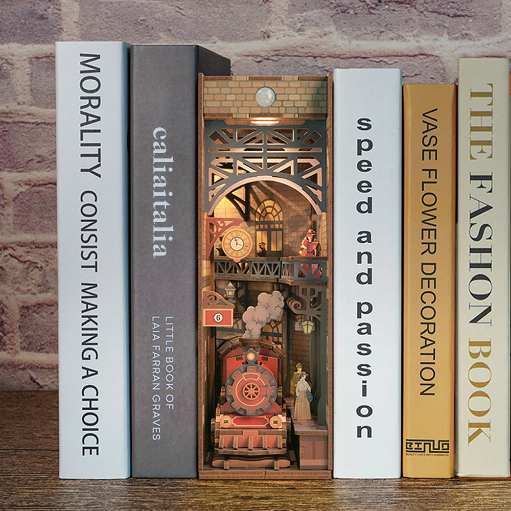 El kit de Book Nook está inspirado en la era del vapor. Hemos creado una locomotora de vapor retro con detalles restaurados casi a escala 1:1, cuyos faros y chimeneas humeantes hacen que el tren parezca aún más realista. En el andén, personas con ropa nostálgica esperan la llegada del tren. Información del producto: ? Número de piezas: 164 ? Material: Madera ? Tiempo de preparación: 3-5 horas ? Nivel de dificultad: ???? Características: ? Materiales de alta calidad: Fabricado con madera contrachapada respetuosa con el medio ambiente. ? Atención al detalle: Incluye accesorios súper detallados. ? Sensor de luz: Incluye un sensor de luz automático que brilla en la oscuridad. ? Instrucciones en inglés: Instrucciones de construcción claras y comprensibles en inglés. Imprescindible para los amantes de los libros y los aficionados al bricolaje: ? Diseño histórico: Un mundo en miniatura repleto de maravillas mecánicas de estilo vintage. ? Mundo en miniatura realista: Piezas de madera elabor