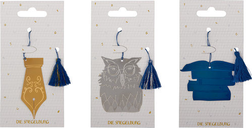 Precioso clip marcapáginas de metal con acabado en oro o plata, y con pompón azul en el tope. Una elegante manera de marcar el punto de los libros, con un diseño único. 3 modelos diferentes en oro, plata y azul royal. Medidas: 4 x 6,5 cm