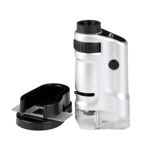 Práctico microscopio para transportar y colocar en cualquier sitio. Lupas de Aumento de 20x a 40x. Baterias incluídas reemplazables ( 3xLR43=AG12), incluye 2 portaobjetos.
