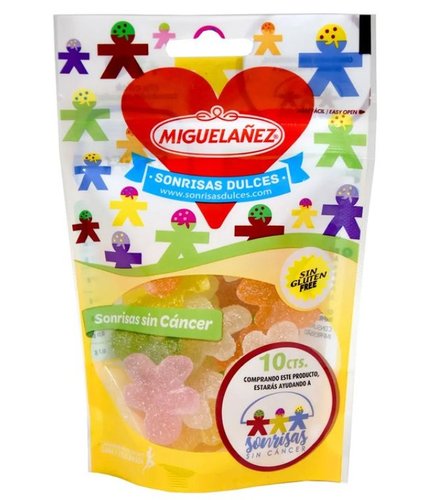 Bolsa cremallera DOYPACK con 95 g. de Caramelos de Goma SONRISAS SIN CANCER. La campaña solidaria de Miguelañez, celebra este año su decimotercera edición y lo hará con la Asociación Sonrisas sin Cáncer como protagonista. Ambas entidades han manifestado su alegría por esta colaboración. La campaña comenzará el próximo 7 de octubre, Día Mundial de la Sonrisa, y finalizará el 6 de enero de 2023. La recaudación de fondos se hará del modo habitual, a través de los clics en el video viral que se alojará en www.sonrisasdulces.com y por la venta de un producto solidario que este año será el Doypack ?Sonrisas sin Cáncer?. En España, cada año se diagnostican más de 1.500 niños con cáncer, de los cuales uno fallece aproximadamente cada día, una cifra que no ha mejorado durante las últimas décadas. Por ello esta asociación tiene el gran compromiso de destinar todos y cada uno de los fondos que recauda a la ayuda e investigación de tratamientos y mejora de la calidad de vida. El principal objeti