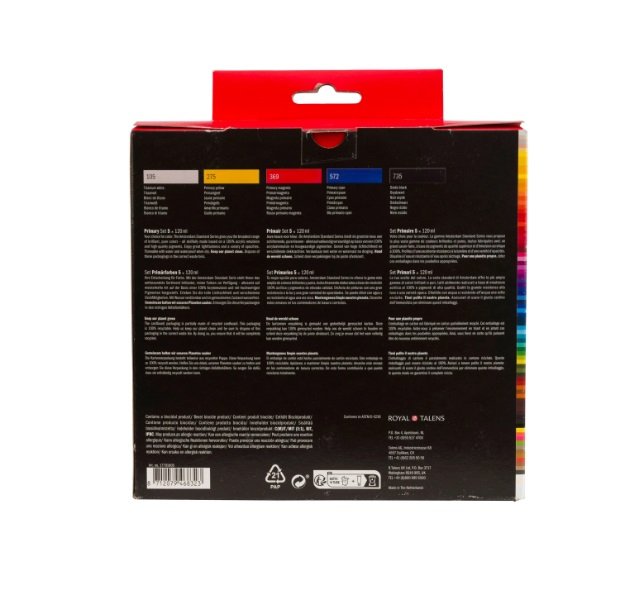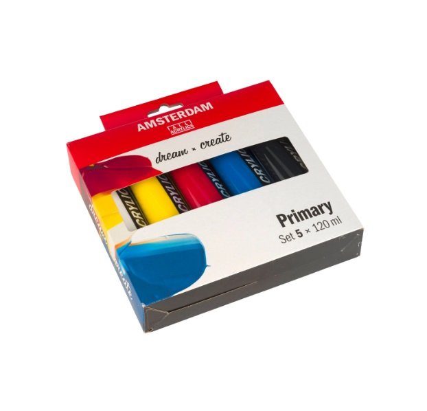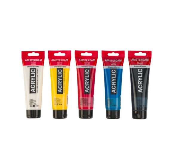 Este set te ofrece los colores perfectos para empezar tu colecci oacute;n de pinturas acr iacute;licas con: Blanco titanio, negro oacute;xido y tres colores primarios para mezcla: amarillo primario, magenta primario y cian primario. Mezcla estos colores para crear una gama infinita de tonos diferentes. Contenido: 5 tubos de 120 ml (105 Blanco titanio ndash; 275 Amarillo primario ndash; 369 Magenta primario ndash; 572 Cian primario ndash; 735 Negro oacute;xido). Standard Series de Amsterdam Nuestra Standard Series te ofrece la m aacute;s amplia gama de acr iacute;licos de colores extraordinariamente vivos. Es f aacute;cil trabajar con esta pintura vers aacute;til, que ofrece una aplicaci oacute;n sin problemas. Puedes usar la pintura directamente del tubo o diluida con un poco de agua o uno de nuestros medios acr iacute;licos. Pintura de viscosidad media para lograr pinceladas visibles, textura y cobertura sin problemas con aca