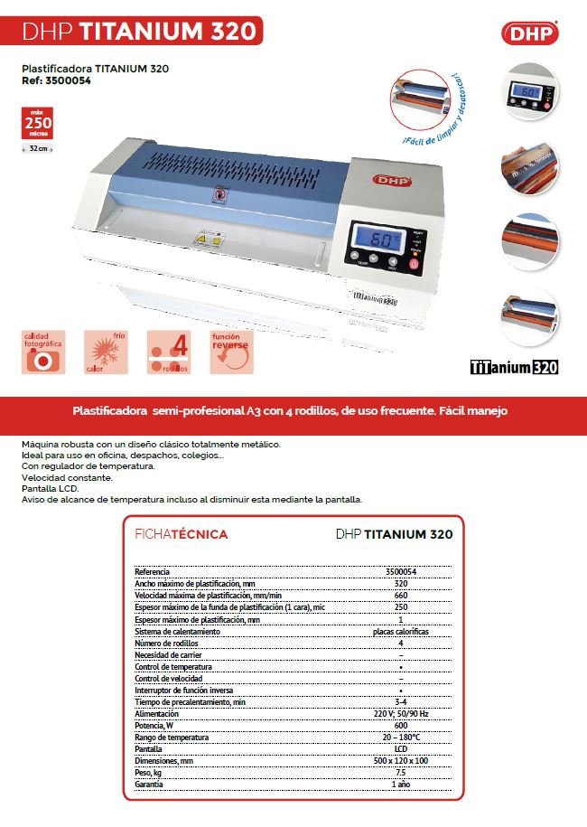 Ancho máximo de plastificación, mm 320 Velocidad máxima de plastificación, mm/min 660 Espesor máximo de cartera (1 cara), mic 250 Espesor máximo de plastificación, mm 1 Sistema de calentamiento infrarrojos Número de rodillos 4 Necesidad de carrier no Control de temperatura sí Control de velocidad no Interruptor de función inversa sí Tiempo de precalentamiento, min 3-4 Alimentación, voltios; Hz 220; 50/60 Potencia, W 600 Dimensiones, mm 520×220×110 Peso, kg 7.5 Rango de temperatura 80 - 170ºC Pantalla LCD Garantía 1 año 320 Titanium 320 Plastificadora Titanium 320 Ref. 3500054