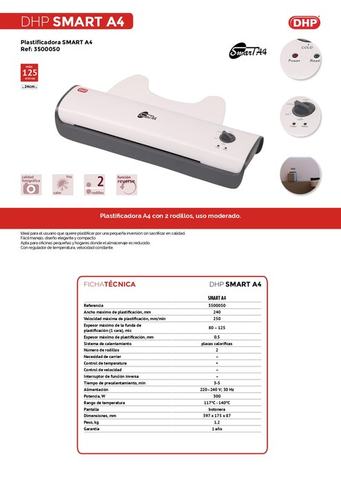 Añadir a mi cestaPlastificadora A4 con 2 rodillos, uso moderado. Ideal para el usuario que quiere plastificar por una pequeña inversión sin sacrificar en calidad. Fácil manejo, diseño elegante y compacto..