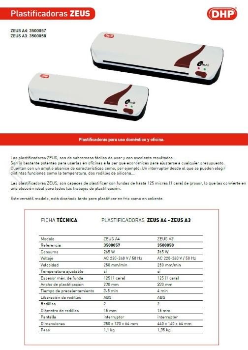 PLASTIFICADORA ZEUS A4 USO DOMESTICO Y OFICINA PEQ