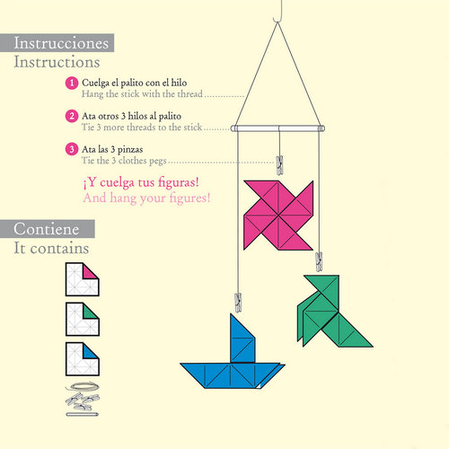 Contenido: 3 cuadrados (con hendidos), 3 pinzas, 1 palito y 1 hilo