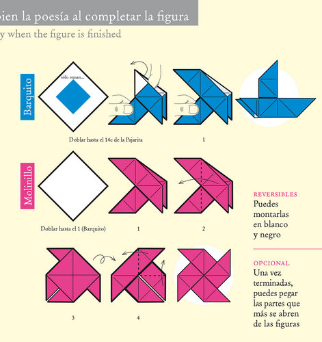 3 poemas en 3 figuras de papiroflexia para montar Reversibles, con fondo en color (español) o blanco (inglés).