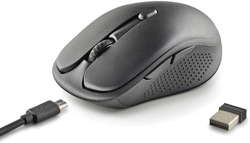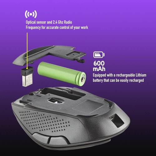 Ratón inalámbrico recargable con teclas silenciosas.Cuenta con sensor óptico y RF de 2,4 Ghz.Dispone de un sensor de alto rendimiento, completamente ajustable. DPIs: 800/1200/1600.Equipado con una batería de litio recargable de 600 mhA, fácil de cargar con el cable Micro USB (incluido).Incluye una rueda de desplazamiento de goma antideslizante con un diseño óptimo de deslizamiento y 5 botones.Botones silenciosos: sus suaves y silenciosos clics te ayudarán a desprenderte de las preocupaciones de molestar a las personas de tu alrededor, ya que reduce el sonido hasta un 90 .Diseñado especialmente para usuarios diestros.Incorpora base de teflón para asegurar un perfecto deslizamiento en cualquier superficie.Botón de encendido/apagado para ahorro de energía.Tamaño compacto (62 x 38 x 105 mm) ideal para utilizar con tu portátil.Hasta 50 horas de duración de la batería con una sola carga.Alcance inalámbrico de 8-10 m. quot;Plug and Play quot;.