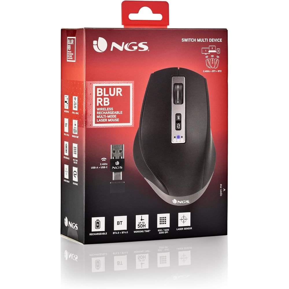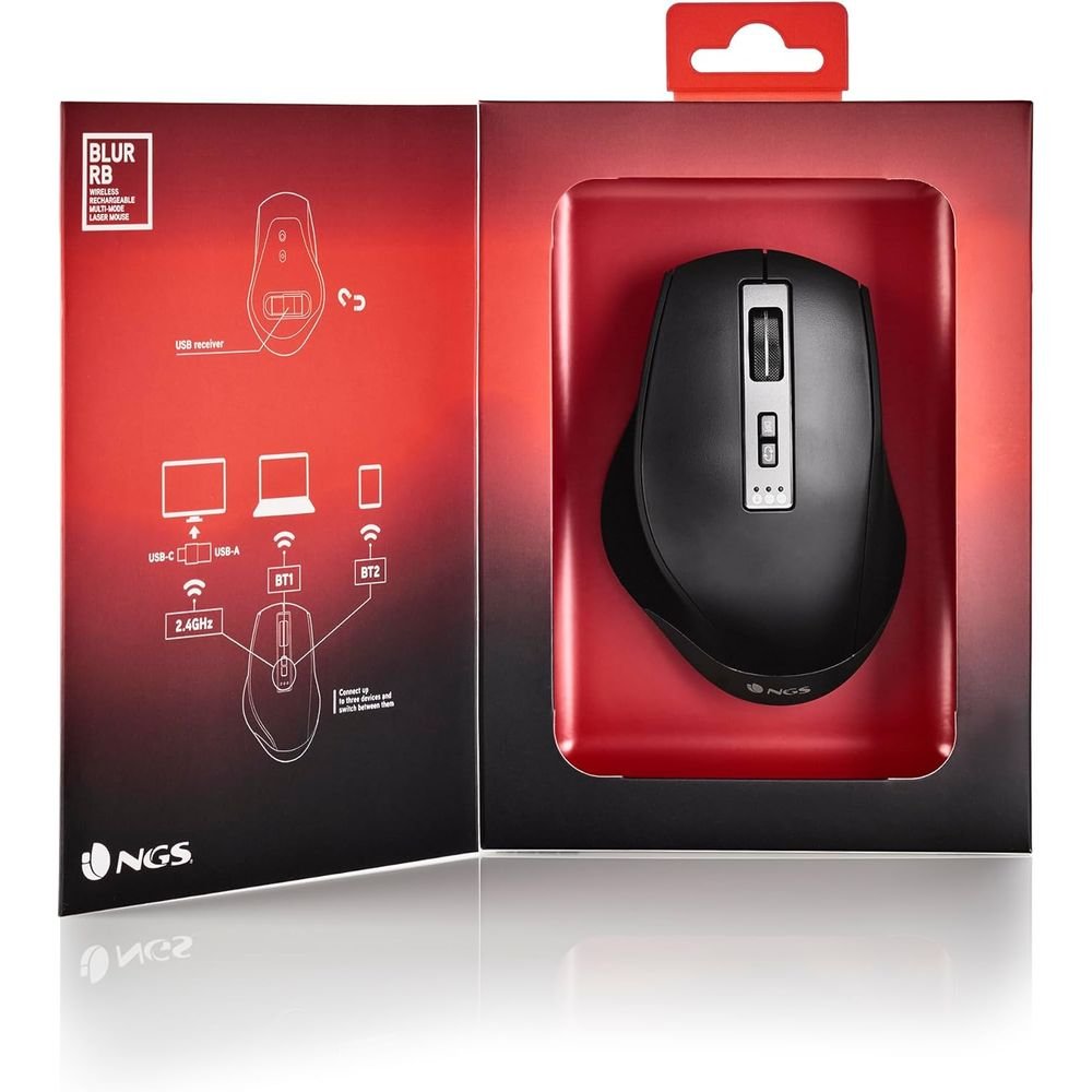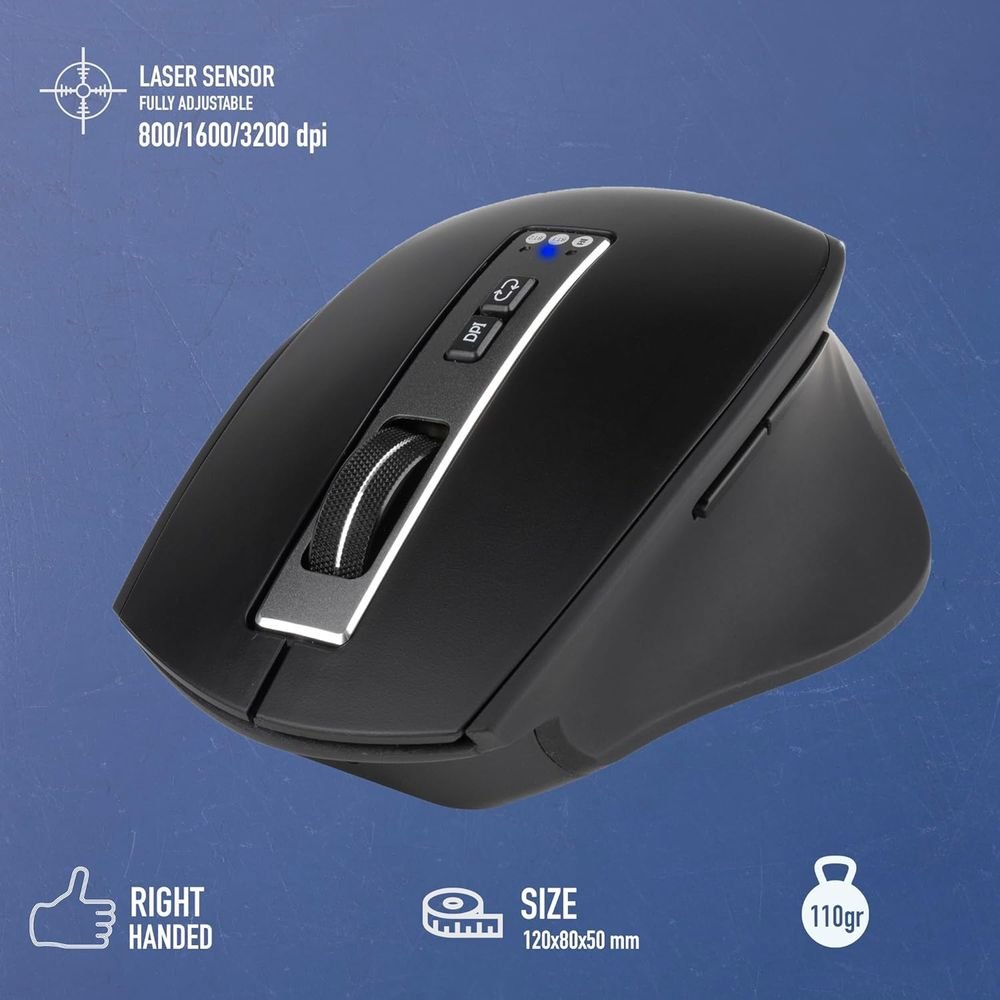 Ratón inalámbrico multidispositivo Bluetooth LASER recargable 2.4Ghz (USB-A + USB-C) + BT3.0 + BT5.0Este ratón inalámbrico tiene conexión tri-modal (2.4Ghz + BT3.0 + BT5.0): Soporta 3 dispositivos al mismo tiempo y cambia rápidamente entre ellos a través del botón de cambio de modo.Dos canales para la conexión BT3.0 y BT5.0 ofrecen 10M de distancia de funcionamiento y reconexión automática.Un canal para Dongle de 2,4Ghz (USB-A + USB-C) con conexión potente y fiable.Equipado con una batería de litio recargable que se puede cargar fácilmente con el cable USB-C incluido.Cuenta con un sensor LÁSER de alto rendimiento, DPIs totalmente ajustable: 800/1600/3200.Incluye una rueda metálica antideslizante para unámejor agarre con scroll y 6 botones.áDiseñado especialmente para usuarios diestrosIncorporaábase de teflón para asegurar un perfecto deslizamiento en cualquier superficieControl preciso: El sensor láser le proporciona un control preciso en múltiples superficiesAlcance inalámbrico de 8-1