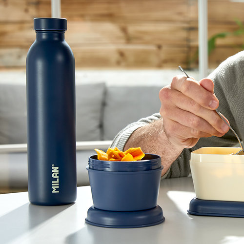 Recipiente para alimentos redondo color azul marino. Tapa roscada que proporciona un cierre hermético. Apto para calentar en microondas (máx. 70ºC) con la tapa abierta para liberar el vapor. Apto para congelador (hasta -20ºC). Apto para lavar en el lavavajillas (máx. 70ºC). Las tapas y los recipientes son fácilmente apilables entre sí. Acabado exterior mate, para facilitar la sujeción. Interior con acabado brillante para favorecer su limpieza. Material: plástico libre de bisfenol A (BPA free). Medidas: 10 Ø x 7 cm. Capacidad: 0,25 litros.