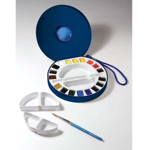 Un set de 18 colores populares de la gama Aquafine de Daler Rowney. Los Aquafine Travel Sets de Daler-Rowney ofrecen a los artistas una mezcla de colores de acuarela en medio godet, un pincel y un estuche, lo que facilita que los estudiantes de arte y los artistas trabajen en sus pinturas desde donde quieran. Una vez que se haya gastado la pastilla de acuarela, simplemente hay que cambiarla por un medio godet nuevo o diferente para asegurarse de que el set de viaje Aquafine esté siempre equipado. La gama Aquafine de Daler-Rowney se especializa en acuarelas, en tubos y medias bandejas, así como en gouache (también conocido como acuarelas opacas) y sus acompañamientos como medios, pinceles, blocs y mesas de trabajo, brindando a los estudiantes de arte y artistas experimentados una acuarela completa. colección de productos armoniosos.