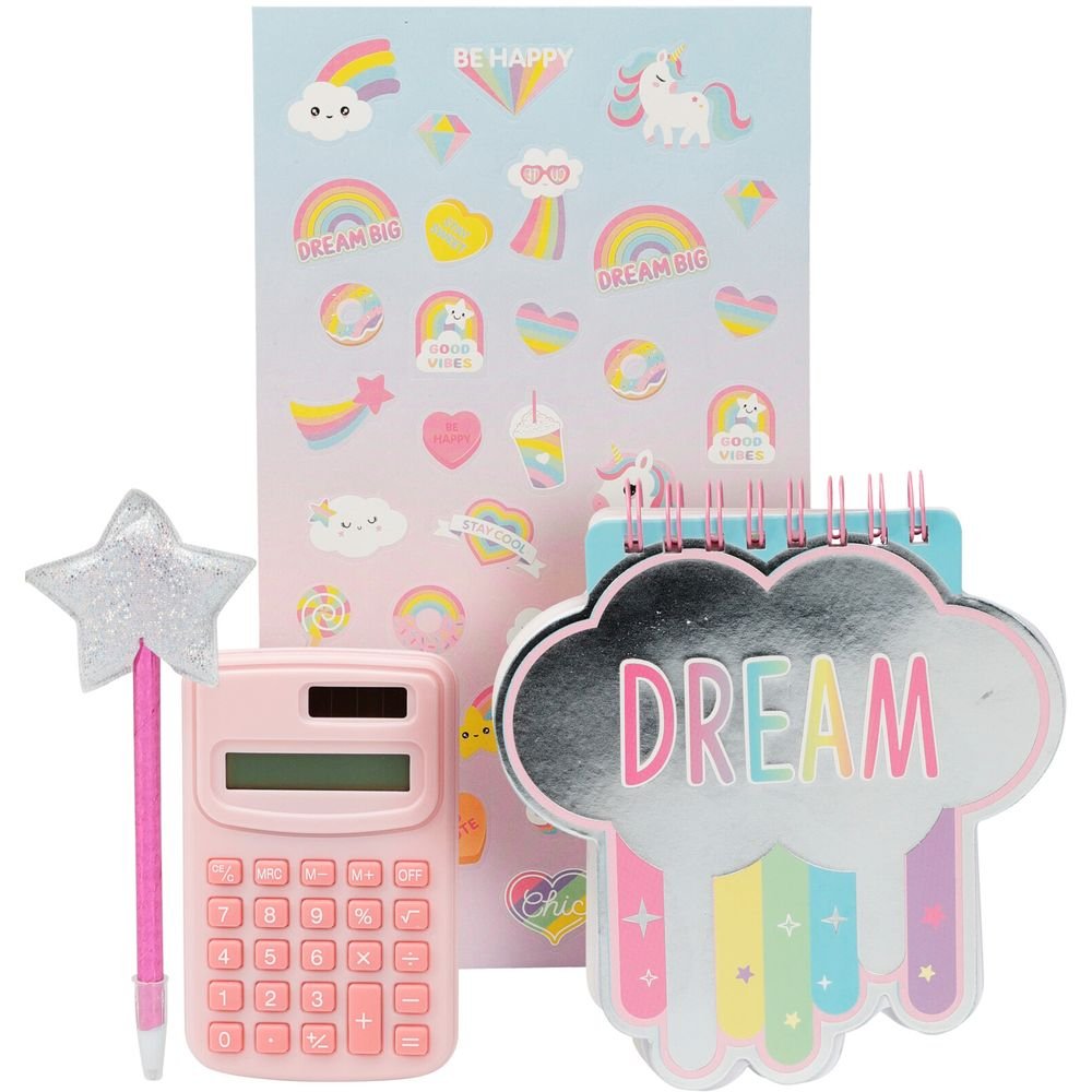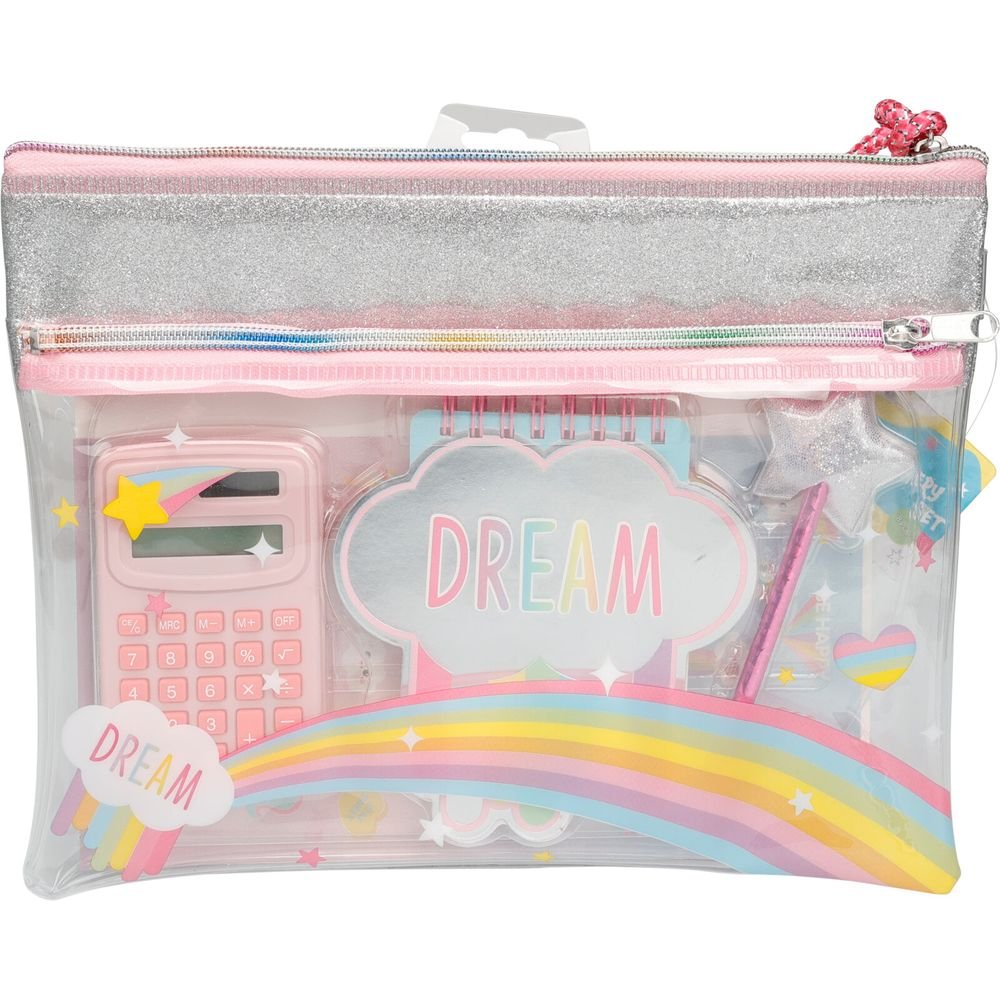 JUEGO DE 8 ARTÍCULOS DE PAPELERÍA, TAMAÑO 270X210X15MM. INCLUYE: 1 BOLSA DE PVC CON CREMALLERA Y DOBLE IMPRESIÓN, 1 BLOC DE NOTAS CON FORMA DE ESPIRAL DE 80 G/M² Y 60 HOJAS, 1 CALCULADORA, 1 BOLÍGRAFO, 1 HOJA DE PEGATINAS. PESO: 200 GRAMOS. 2DISEÑO: TBD. CON ETIQUETA COLGANTE
