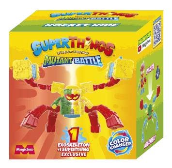 íDescubre la nueva serie de SuperThings Mutant Battle 12 nuevos Exoskeletons para coleccionar, con nuevos ataques especiales. Por primera vez, el SuperThing que los acompaña es exclusivo y cambia de color con el agua fría y caliente. ¿Encontrarás el ultra-raro dorado? Los SuperThings son objetos cotidianos transformados en superhéroes y supervillanos. Viven en Kaboom City y cada SuperThing tiene su rival: busca las parejas rivales y completa los equipos. íLa acción está asegurada Contiene: ?1 ExoSkeleton ?1 SuperThing Color Change exclusivo ?1 Checklist