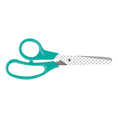 Tijeras basic edición Sunset. Hoja de colores degradados Sunset por un lado y estampado geométrico de topos en blanco y negro por el otro. Cuchilla de acero inoxidable con punta redondeada. Mango de plástico color turquesa. Ideal para uso escolar. 13,4 x 5,3 x 1,1 cm.