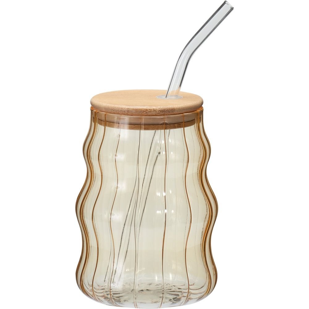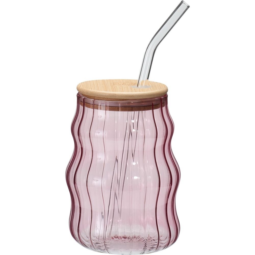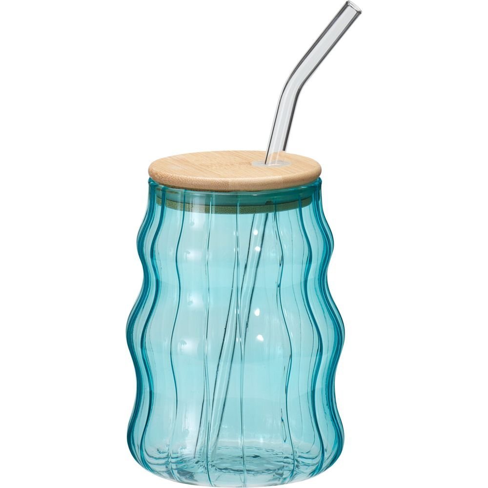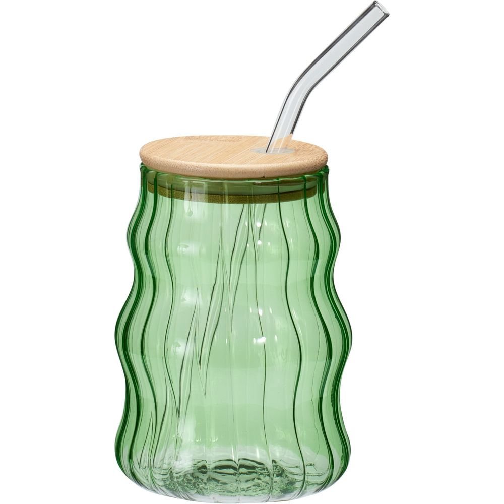 DRINKING GLASS, BOROSILICATE GLASS, GLASS STRAW WITH BAMBOO LID AND SILICONE RING/PARTS IN LID, 500ML/16,95 OZ, SIZE: DIA 90X126MM, WEIGHT: 177 GRAM, WOBBLING DESIGN WITH STRIPE EFFECT, IN 4 ASSORTED COLORS: GREEN/BLUE/PINK/YELLOW WITH TRANSPARENT COLOR STRAWS, STRAWS PACKED SEPERATELY, HANDWASH ONLY