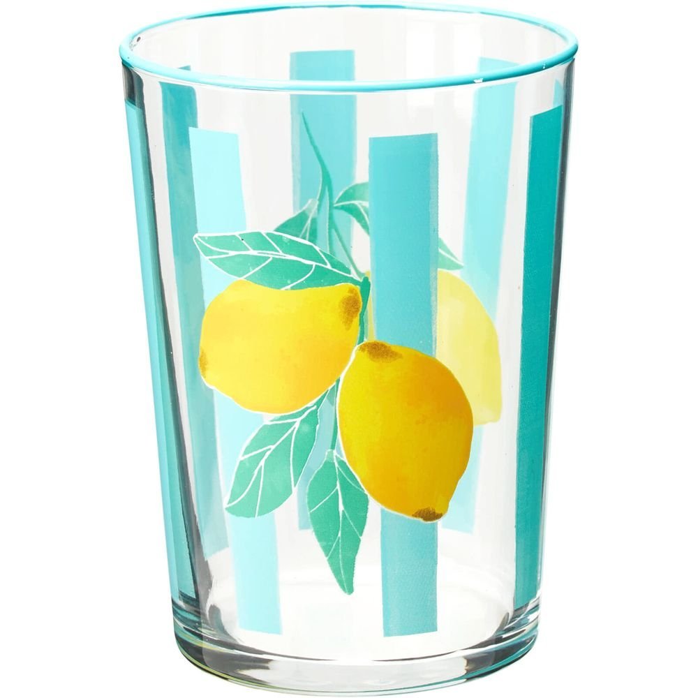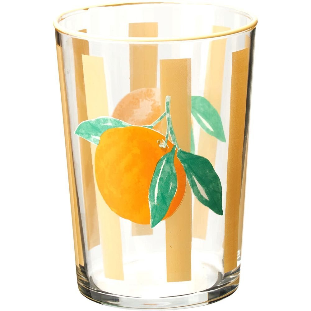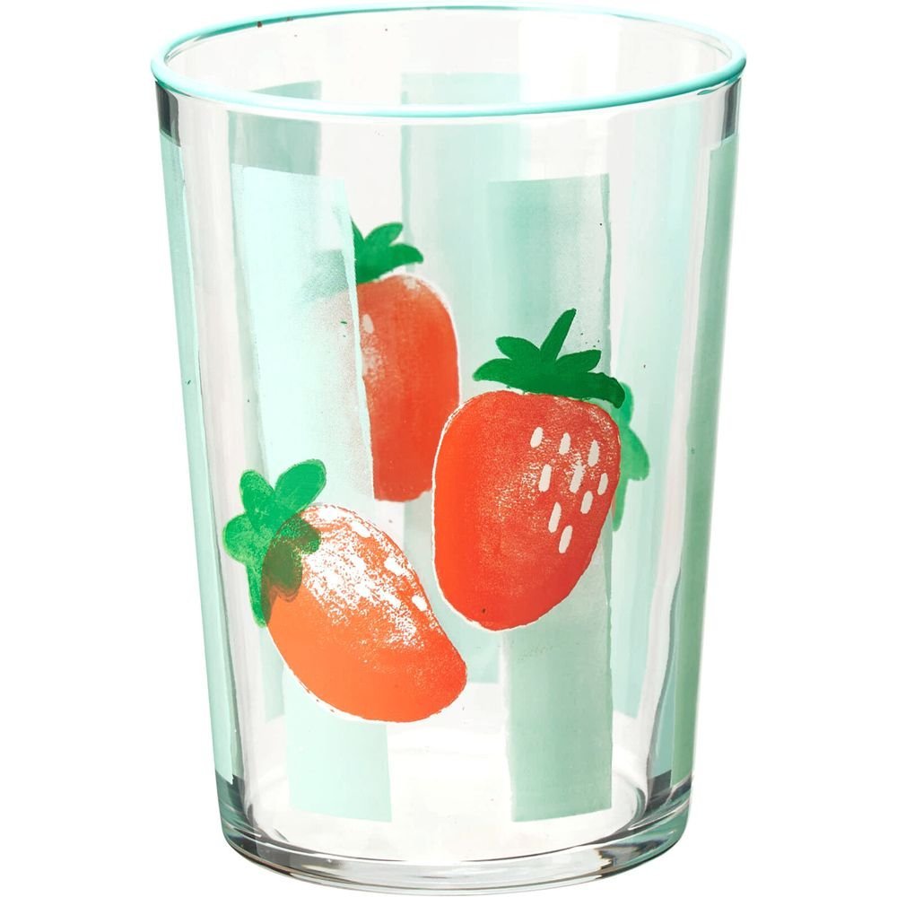 DRINKING GLASS, 510ML/17.25 OZ, SIZE: DIA 88XH120MM, WEIGHT: 240 GRAM, 3 ASSORTED FRUIT DESIGNS WITH COLOUR LINES ON BACKGROUND: STRAWBERRY/ORANGE/LEMON, WITH COLORED MATCHING RIM. WITH BARCODE STICKER ON THE BOTTOM